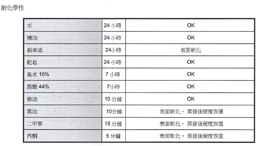 產品經測試耐化學反應:機油、柴油、汽油、異丙醇、丙酮、硫酸(36%)、腐蝕性蘇打/碳酸納(5%)、鹽酸(10%)、滲透水和二甲苯這些都可以抗酸、抗鹼。