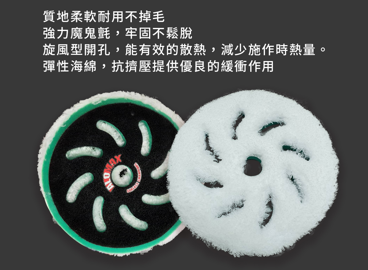 質地柔軟耐用不掉毛;強力魔鬼氈,牢固不鬆脫;旋風型開孔,能有效的散熱,減少施作時熱量;彈性海綿,能抗擠壓提供優良的緩衝作用。