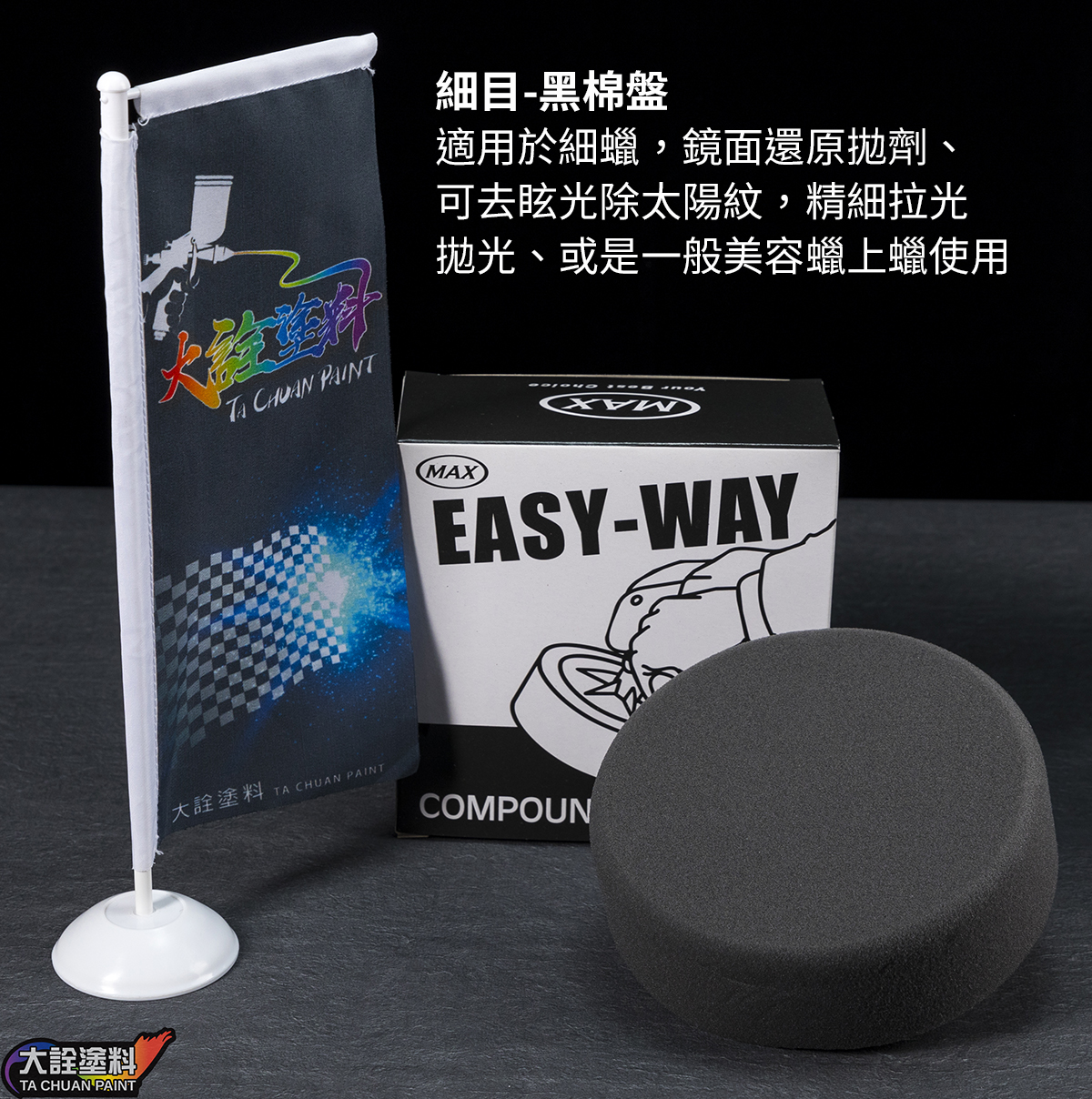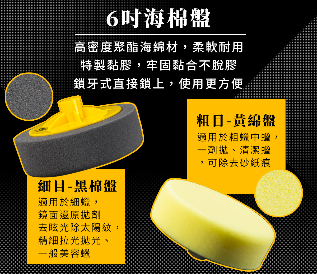 6吋黑綿輪 尺寸:6吋Ø150 mm*厚45mm、總高70mm 螺牙:M16*2.0mm內螺牙 主要材質:聚酯海綿、塑膠盤、黏膠 生產地:台灣