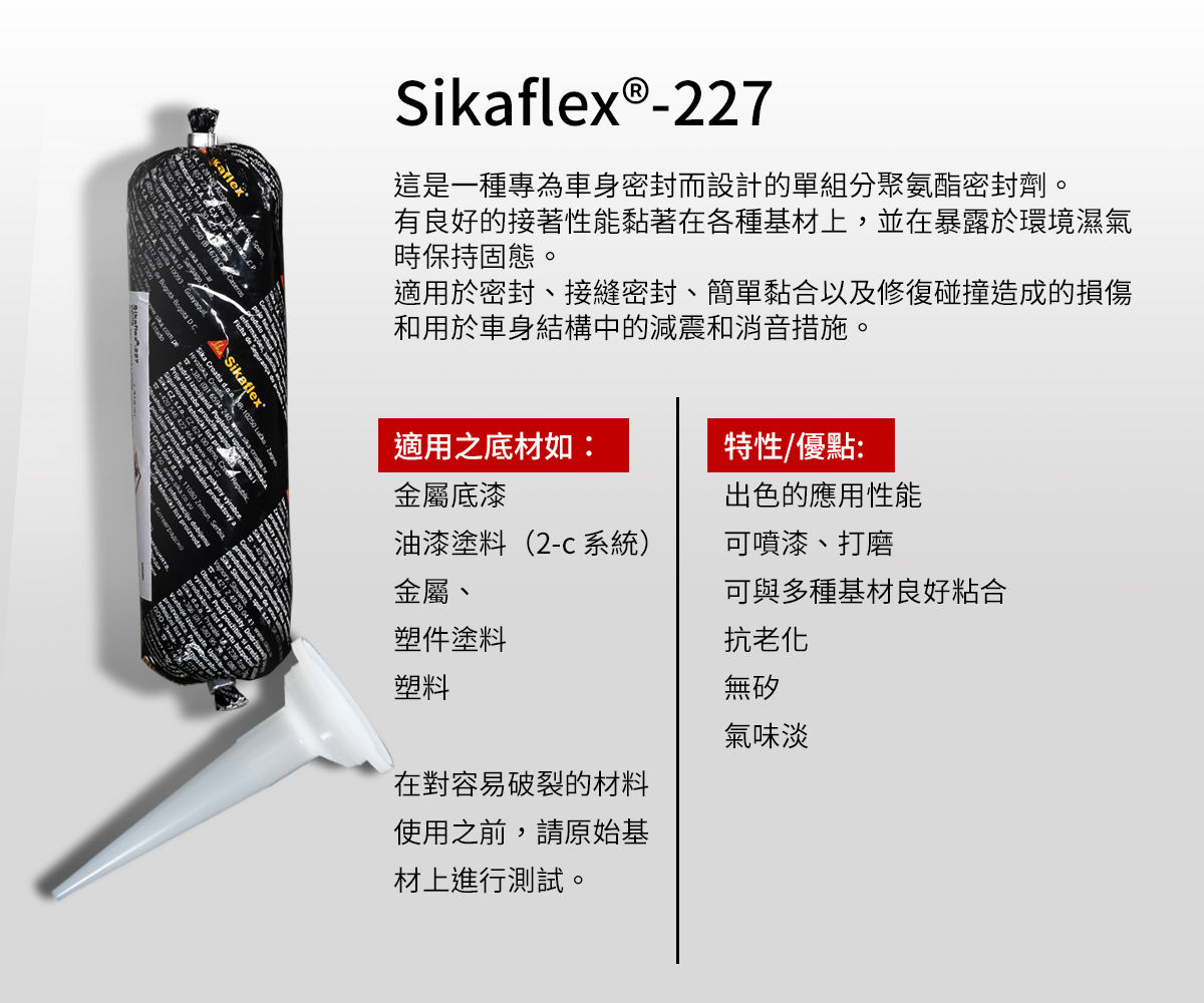 Sikaflex-227 可用於接合、接縫密封、簡單粘合以及碰撞修復和車身製造中的抗震和消音措施。