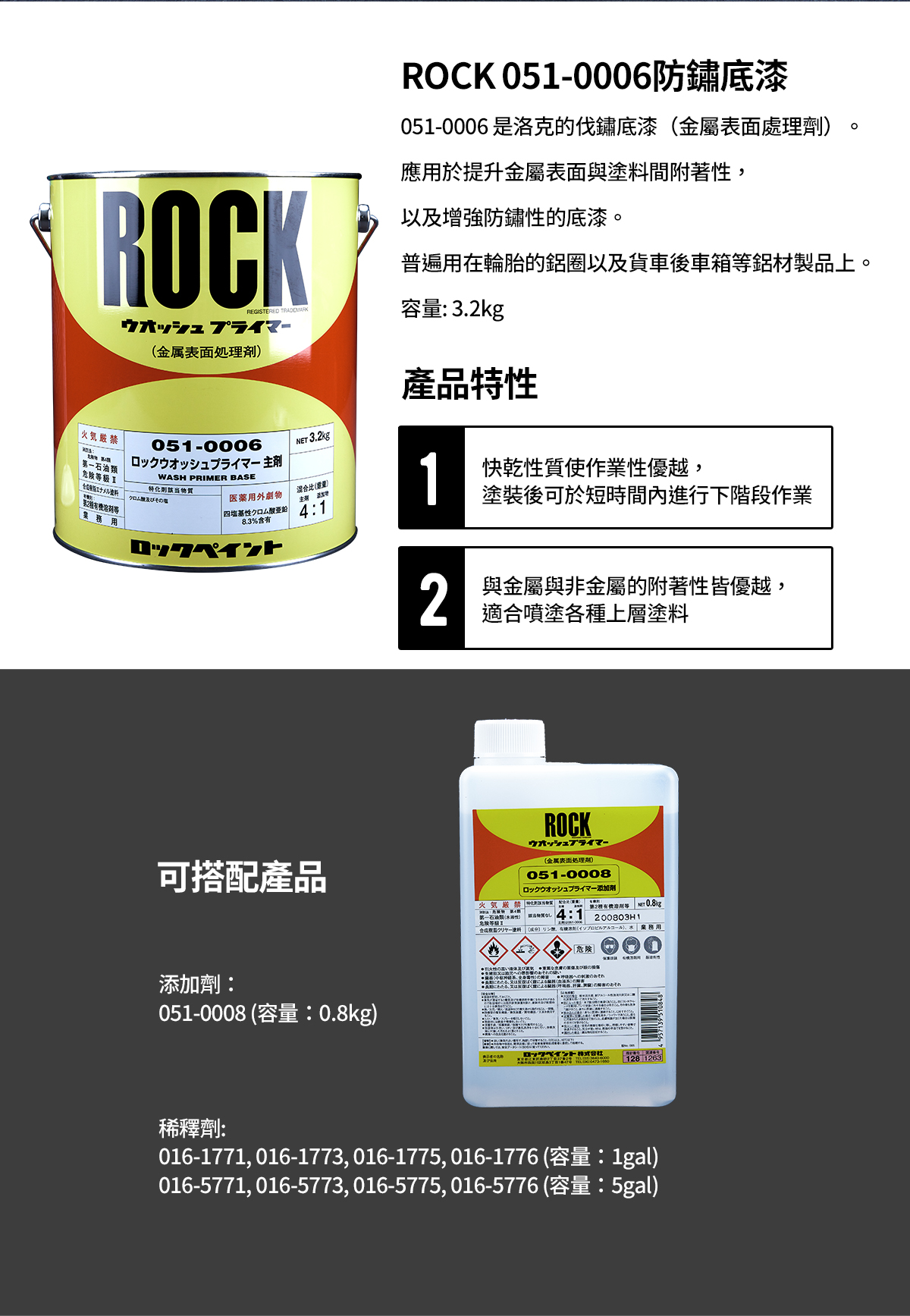 快乾性質使作業性優越,塗裝後可於短時間內進行下階段作業 與金屬及非金屬的附著性優越,可塗裝各種上層塗料 液體中碳酸及酪酸鹽與金屬表面的不同鈍化反應可再提升塗料密著度的安定性。