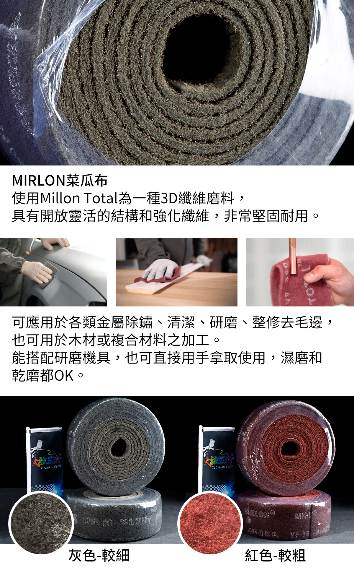 使用Millon Total為一種3D纖維磨料,具有開放靈活的結構和強化纖維網狀界面,磨料的兩面都可以用於研磨,更加方便,柔韌堅固耐用,壽命長。