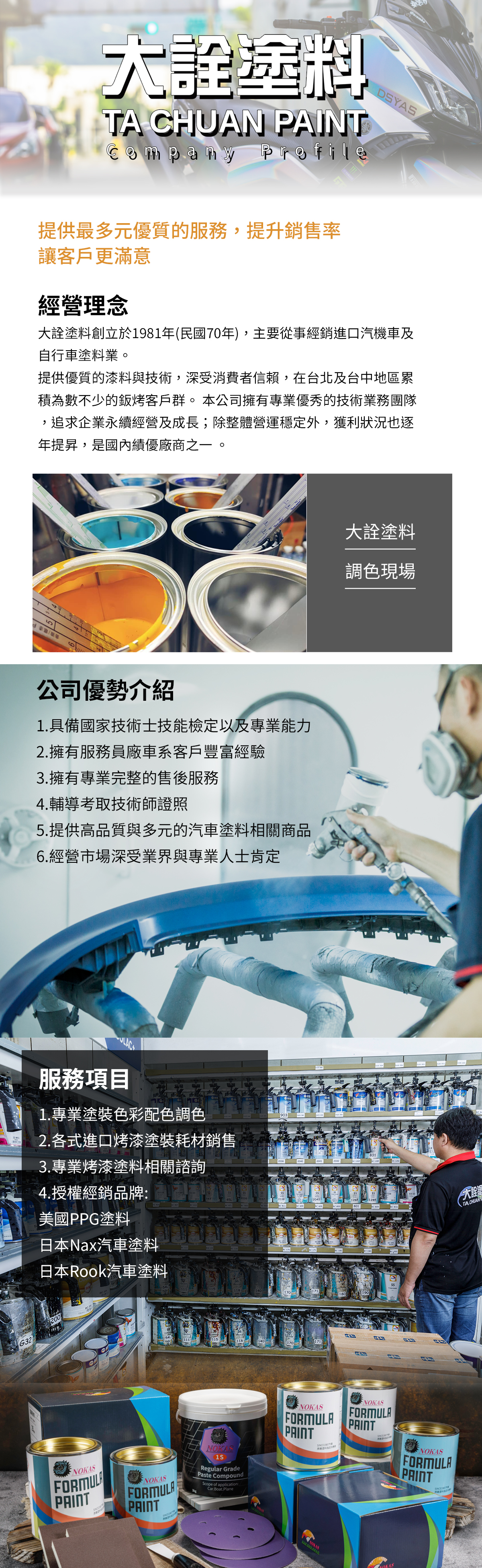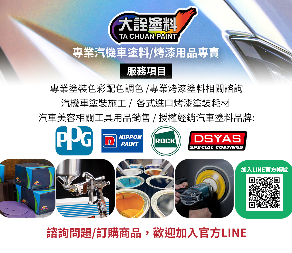 大詮塗料 . 大詮改色中心 . 烤漆專案承攬 . 烤漆廠設廠規劃 . 烤漆相關設備 . 烤漆相關工具.耗材 . 氣手動研磨工具 . 汽車美容相關工具用品 . 經銷進口汽車塗料 . 德國鸚哥塗料 . 美國PPG塗料 . 日本NAX . ROCK塗料 . DSYAS特效塗料